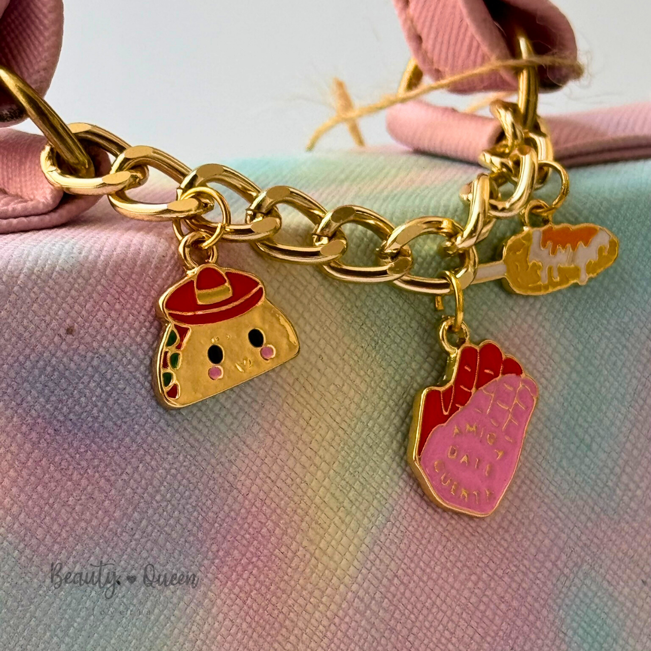 Esta bolsa en tonos pastel vibrantes destaca por sus encantadores charms que representan una paleta de manita, un elote y un taquito, reflejando con alegría la cultura mexicana. Perfecta para darle un toque divertido y único a tu estilo diario.