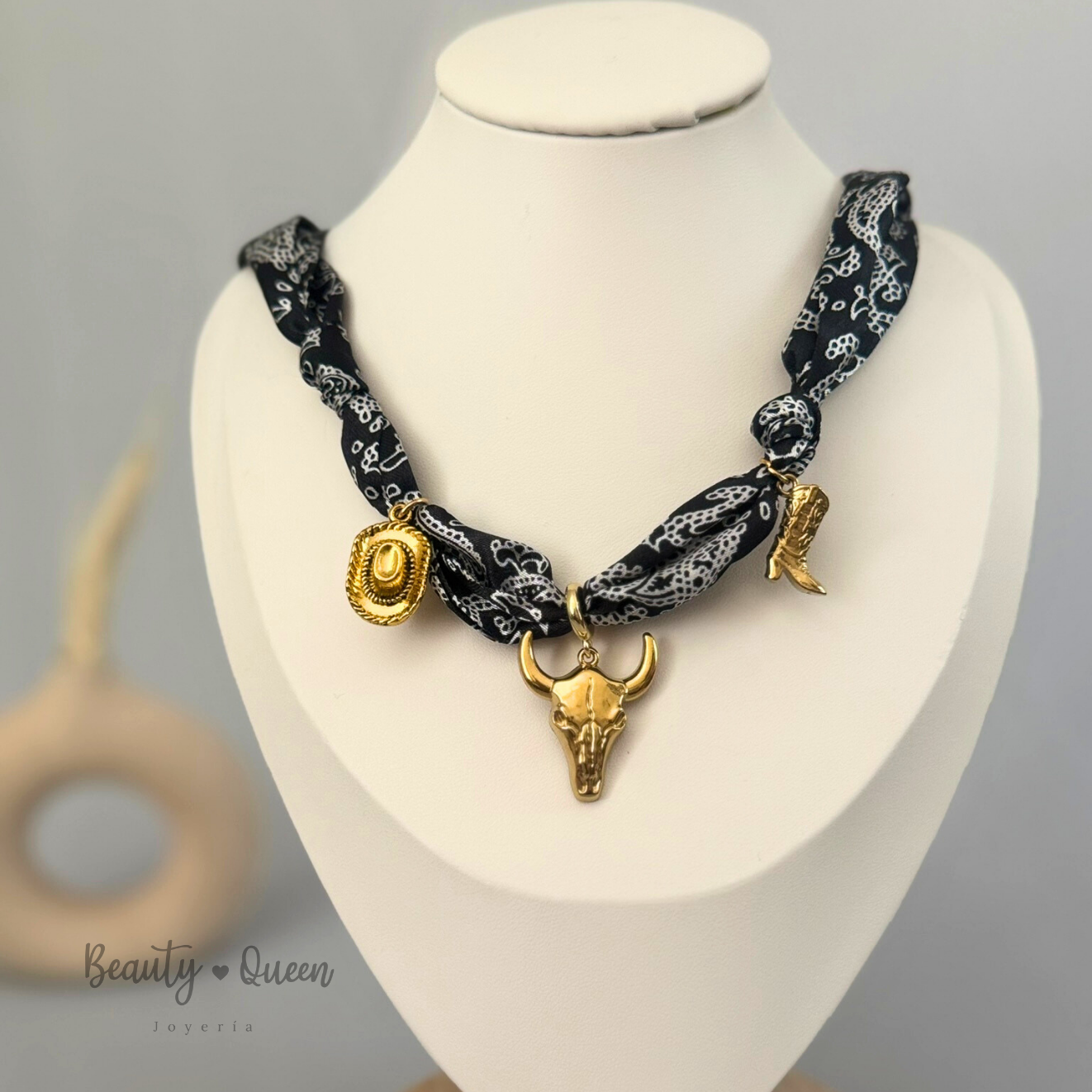 Añade un toque rebelde y divertido a tu estilo con este Collar Bandana Maverick. Con tela estampada y pequeños dijes vaqueros en negro, es perfecto para quienes buscan un accesorio único y lleno de personalidad. Ideal para combinar con looks casuales y darle vida a tu outfit diario.