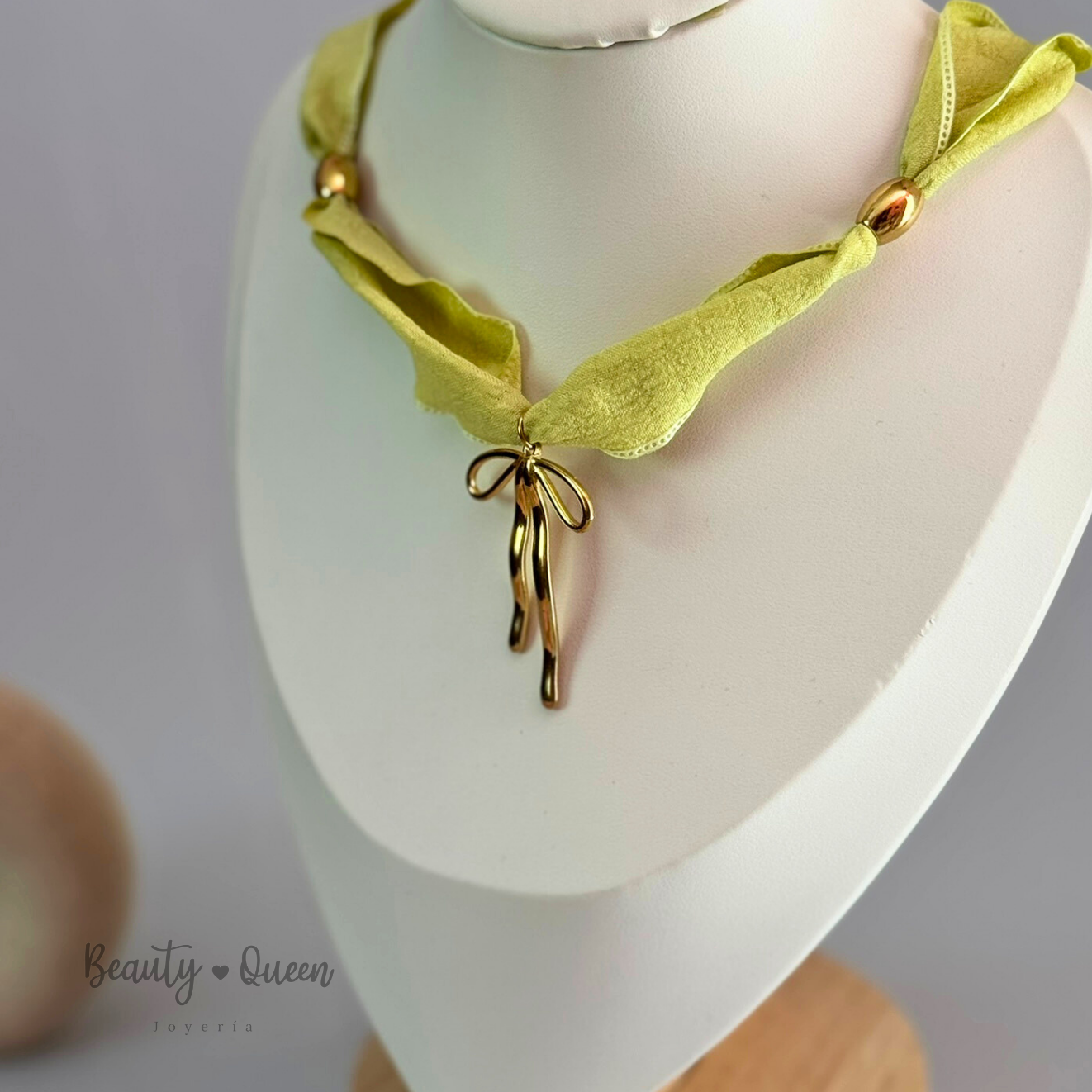 Añade un toque de frescura y diversión a tu look con este collar bandana en vibrante color limón. Su dije de moño en oro laminado aporta un detalle encantador y brillante, perfecto para dar estilo y personalidad a cualquier outfit casual. Ideal para quienes buscan un accesorio alegre y chic que destaque con un guiño juguetón.