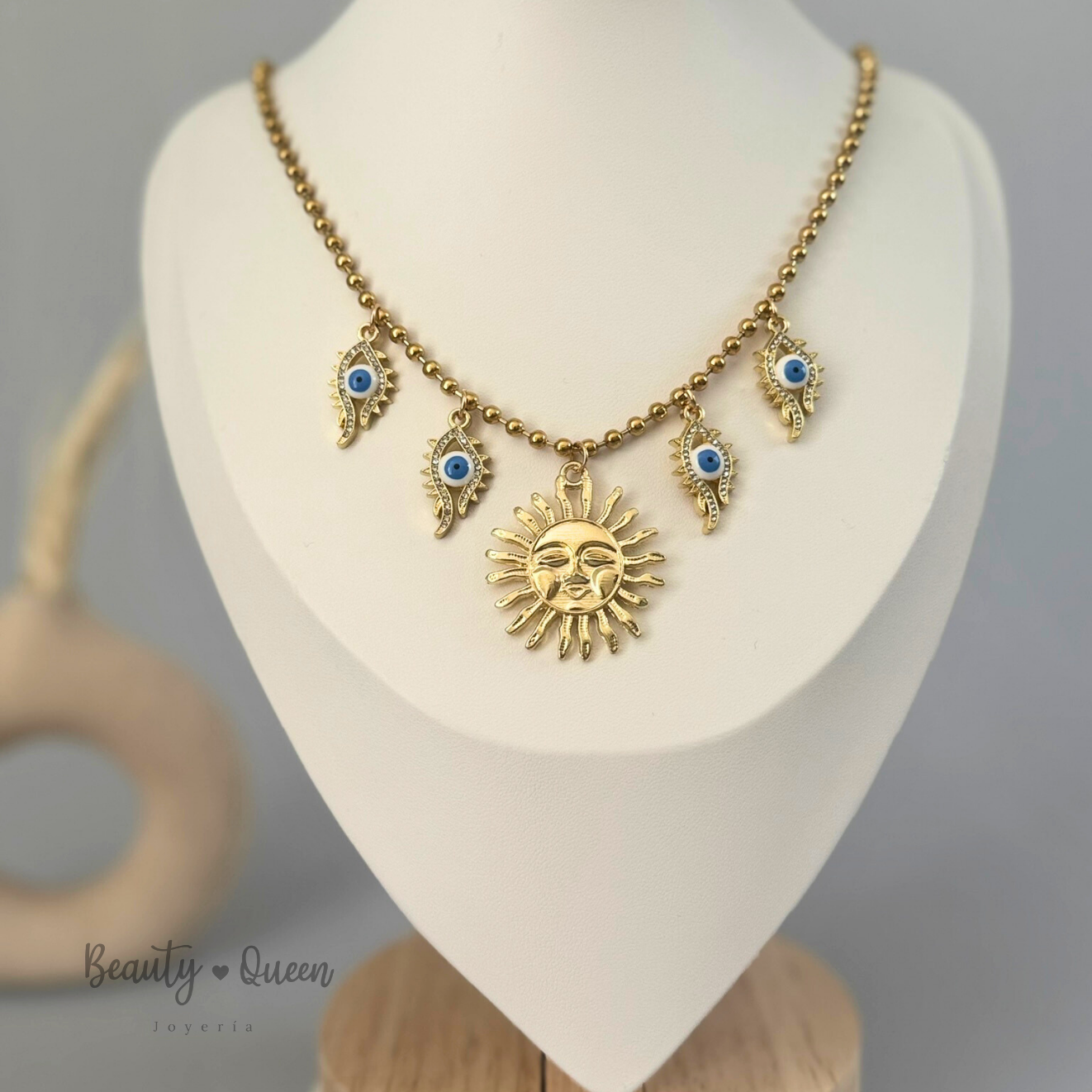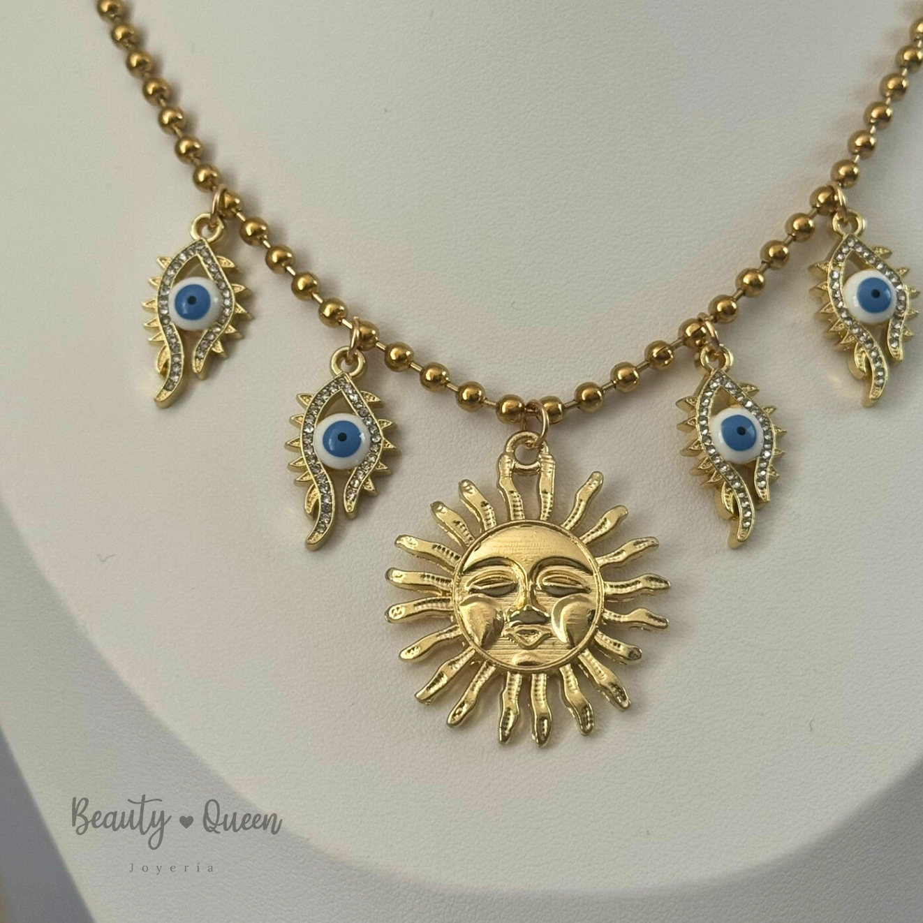 Dale un toque divertido y brillante a tu estilo con este collar de acero inoxidable chapado en oro, adornado con dijes de sol y ojos turcos que protegen y atraen buena energía. Perfecto para iluminar cualquier outfit con personalidad y encanto.