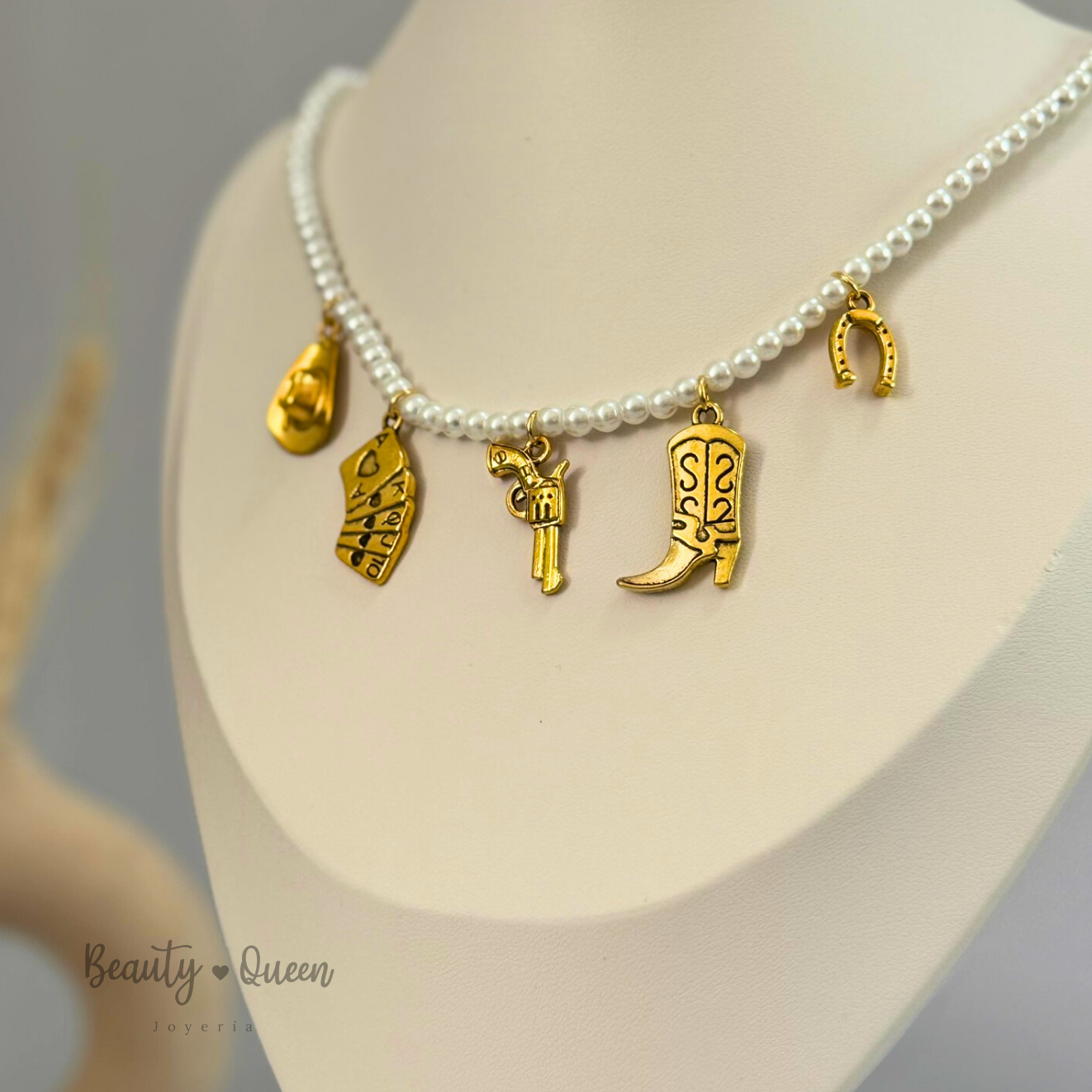 Sumérgete en el mood cowboy con nuestro Collar Texas, que combina perlas delicadas con charms inspirados en el Medio Oriente. Este accesorio divertido y único añade un toque de aventura y estilo a cualquier outfit, perfecto para quienes buscan destacar con un look original y lleno de personalidad.